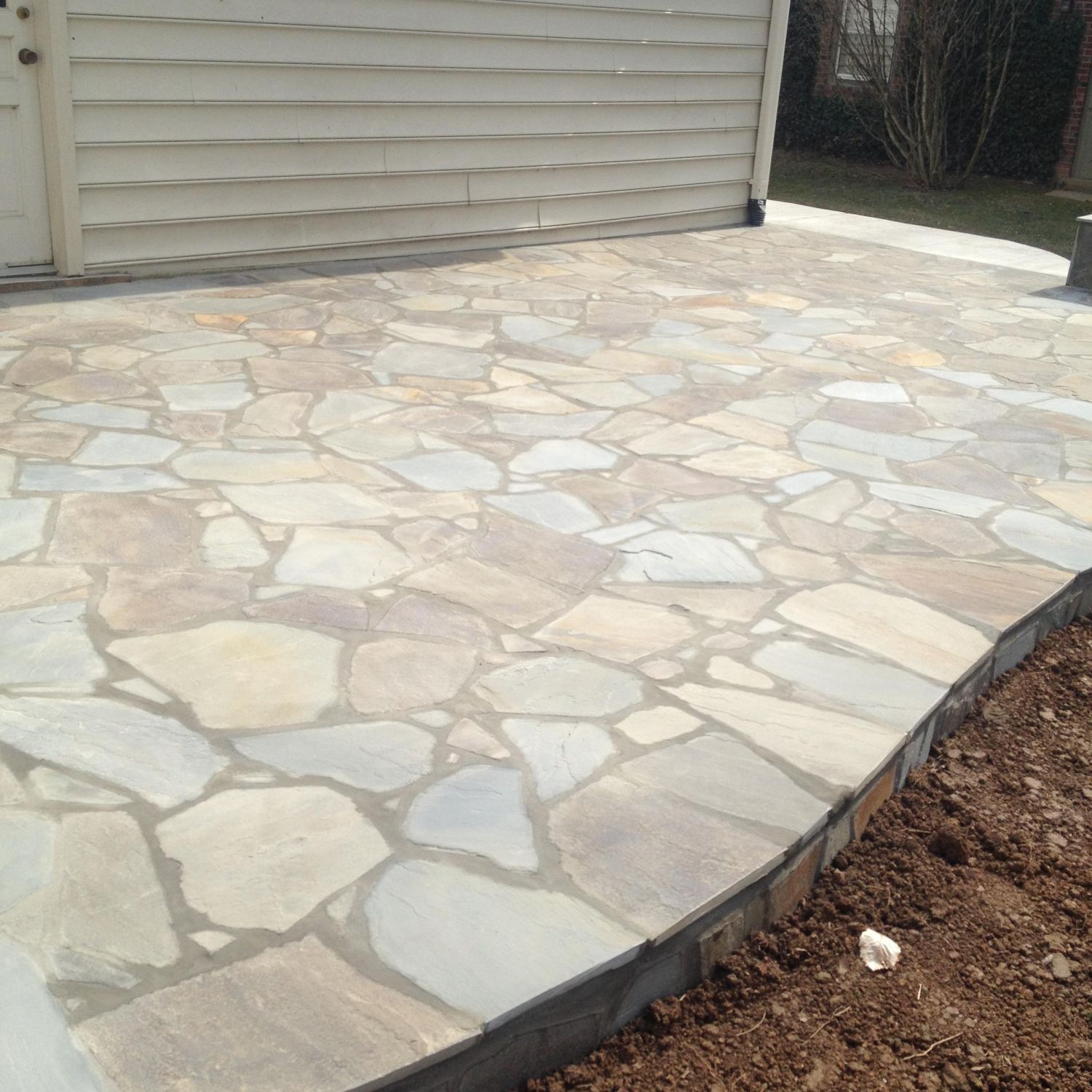 Flagstone Patio Project in Herndon, VAPennsylvania variegated flagstone patio with a sitting wall, on a concrete base. Previous Project Next Project