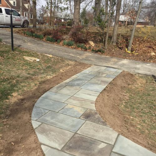 In Annandale, Virginia, we installed this blue pattern Pennsylvania Variegated Flagstone front entryway and sidewalk to replace the original concrete and stepping stones path. We also installed concrete Jacuzzi and shed pads in the backyard.